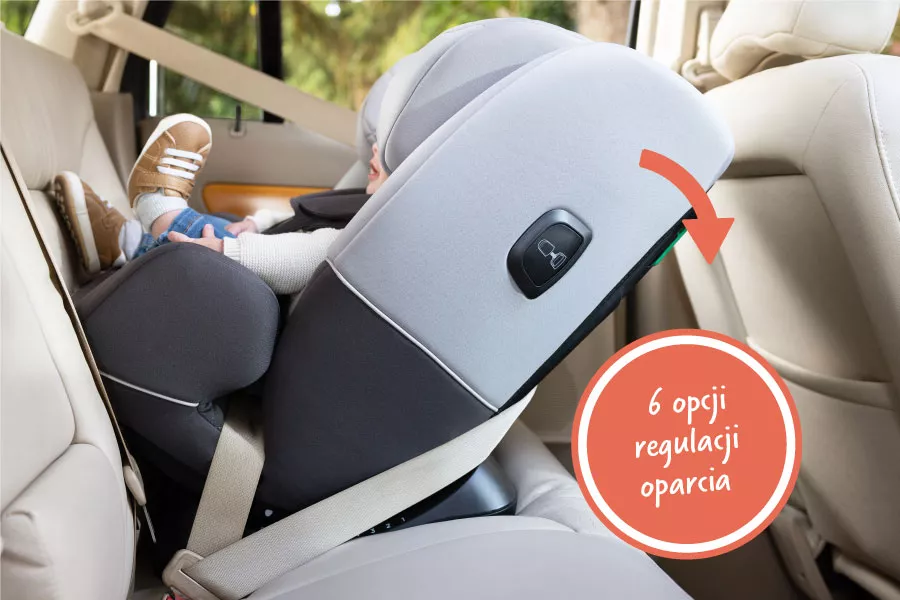 Aż 6 stopi regulacji oparcia – 2 w opcji montażu tyłem do kierunku jazdy i 4 – w opcji przodem, gwarantuje komfort, zwłaszcza podczas długich podróży.