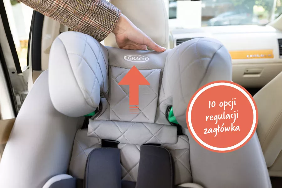 10 opcji regulacji wysokości zagłówka zapewnia solidne podparcie dla dziecka adekwatnie do jego zmieniającego się wzrostu.