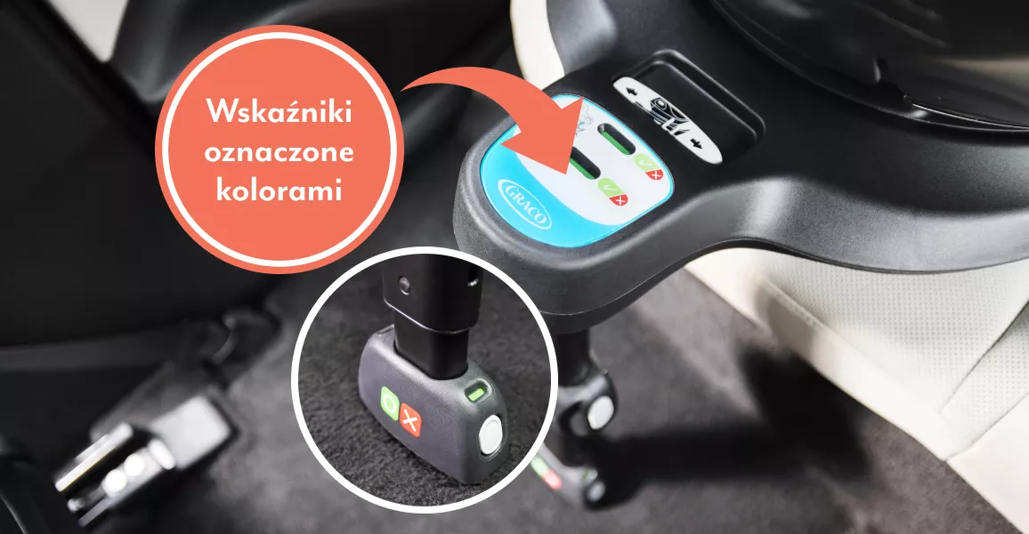 Zintegrowane kolorowe wskaźniki informują, kiedy złącza ISOFIX, noga bazy oraz fotelik samochodowy są prawidłowo zainstalowane.