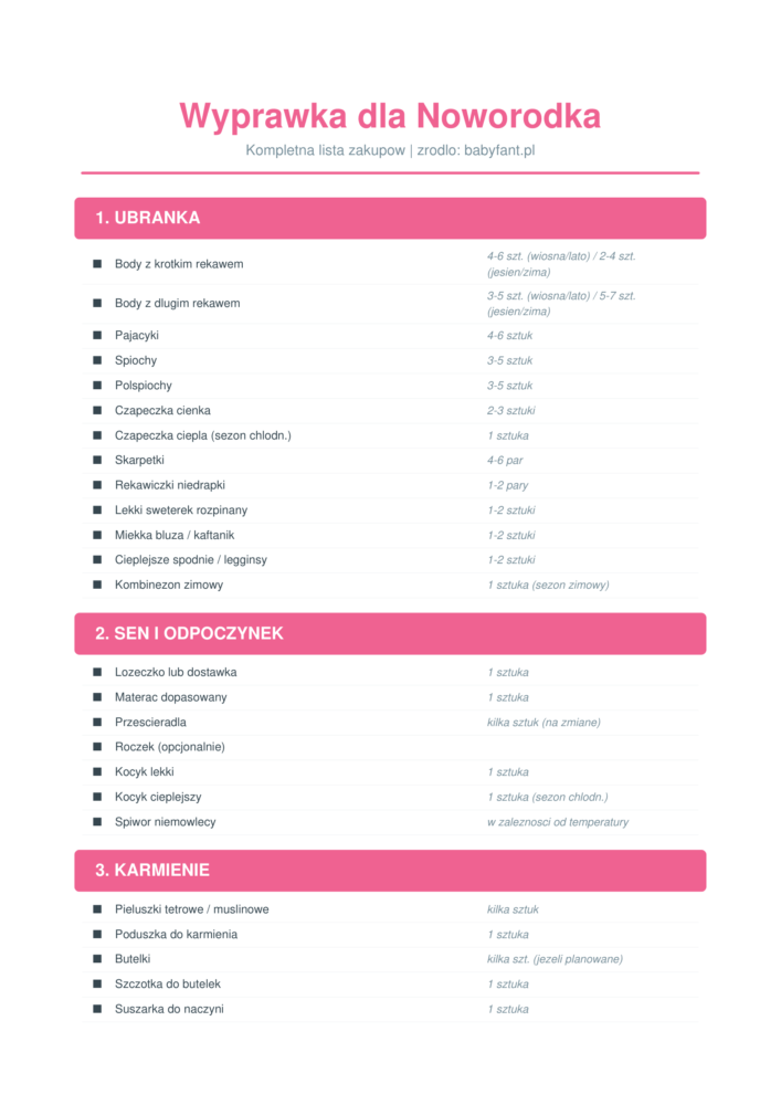 W dalszej części znajduje się szczegółowy podział na rodzaje ubranek, który ułatwia planowanie wyprawki krok po kroku. Taka forma pozwala szybko sprawdzić, czego potrzeba najwięcej, a które elementy mają charakter uzupełniający. Najlepiej sprawdza się praktyczna checklista, ponieważ porządkuje zakupy i pomaga uniknąć przypadkowych decyzji. Dzięki niej łatwiej dopasować garderobę noworodka do sezonu, stylu życia rodziców i częstotliwości prania.